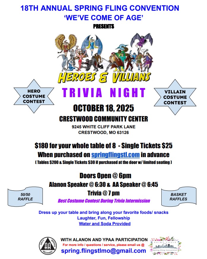 Join Us For Our18th AnnualSpring Fling ConventionCOMMITTEE MEETING!October 26, 2025 – 1:00pmat Central Services Office  Service Information Registration Trivia Night Trivia Night TicketsPlease enter the amount of tickets you would like for each event in the boxes below.Name* First Last Trivia Night Quantity Price: $25.00 Quantity Single ticket $25.00 or a table of 8 for $180.00 We can sell a max of 36 tables of eight for 288 tickets.Table of 8 Quantity Price: $180.00 Quantity Table of 8 for $180.00 and save $20 by buying a table instead of single ticketsName of Table Please Select from the Following AA Al-Anon Phone*Email* Total $0.00 Pay by credit card Pay with Credit Card Pay with Credit Card American ExpressDiscoverMasterCardVisaSupported Credit Cards: American Express, Discover, MasterCard, Visa Card Number Month010203040506070809101112 Year20252026202720282029203020312032203320342035203620372038203920402041204220432044 Expiration Date Security Code Cardholder Name Service Opportunities (Please Fill out form and you will be contacted) First NameLast NamePhoneEmail Years Sober Less than 1 year 1-3 years 3+ years PreferenceEntertainmentAlanonArchivesDecorationsFlyersGreeterHospitalityHostLiteratureMailing & WebProgramRegistrationSecretaryTicketsTreasurerWebNo Preference Contact Us Name*Email*Message*